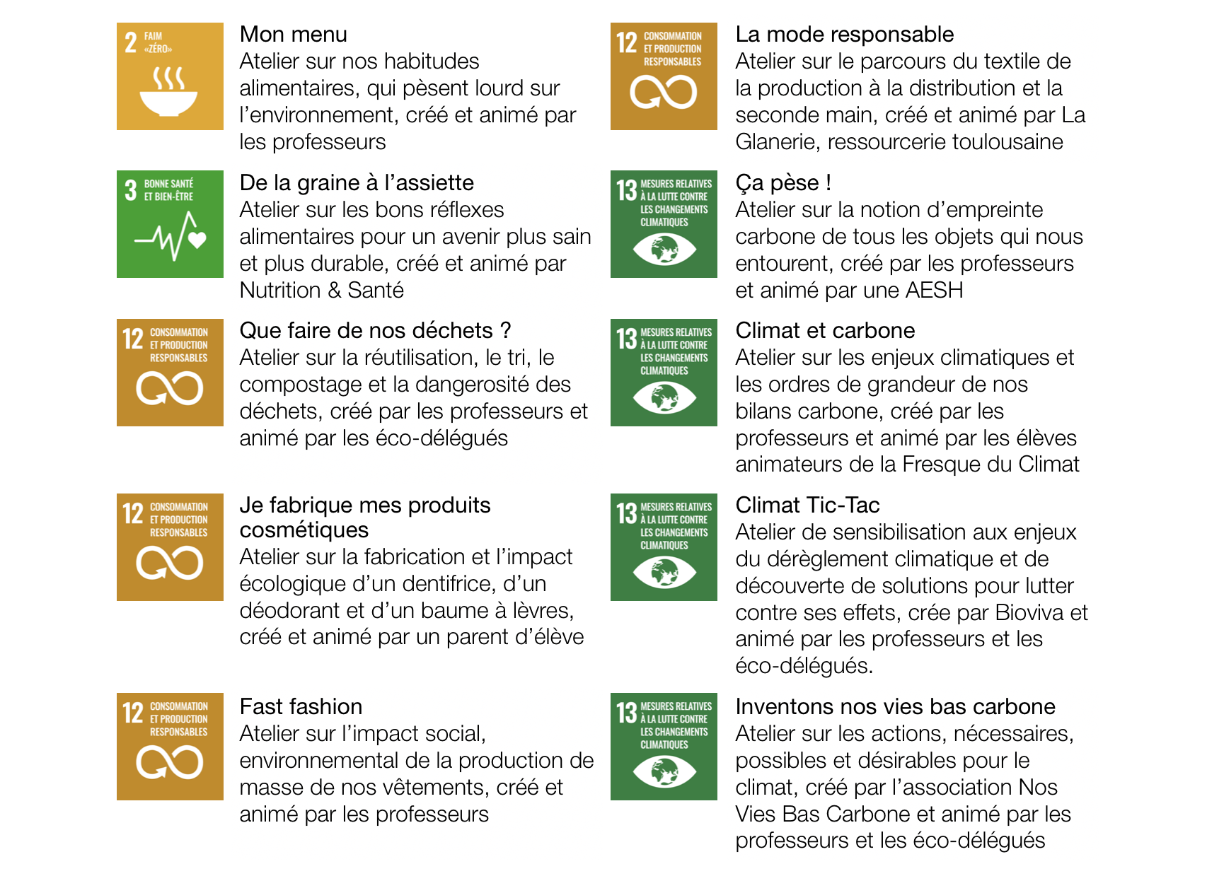 Jeudi 18 décembre 2025 après-midi, à la place des cours habituels, les élèves de 6e participent en groupe à des ateliers en lien avec les objectifs de développement durable de l’ONU, créés et animés par des professeurs, des éco-délégués, des parents d’élèves, des associations ou encore des partenaires.