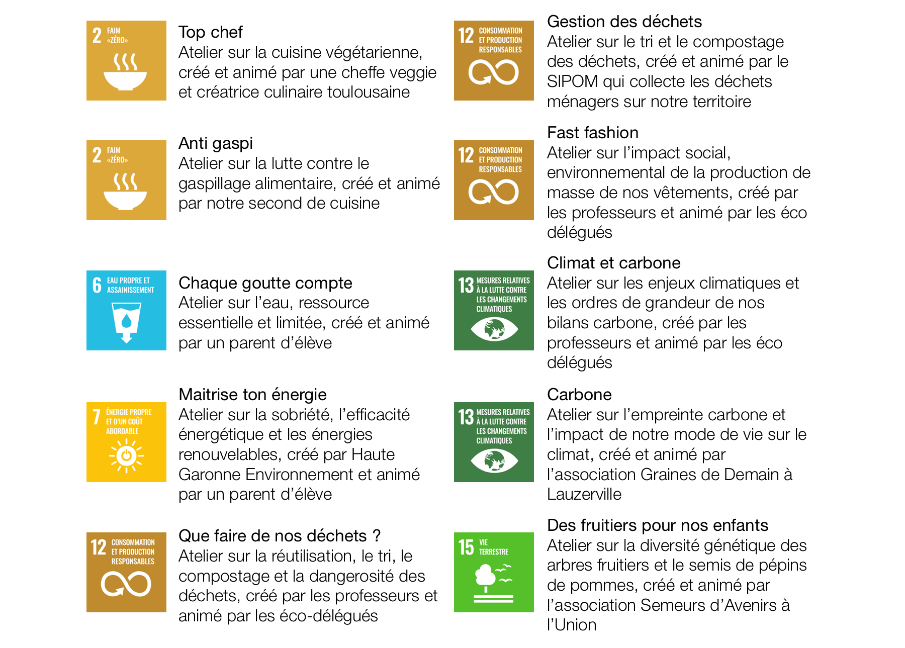 En ce sens, nous organisons un temps fort jeudi 16 octobre après midi pour tous les élèves de 5e : les cours habituels sont annulés et les élèves vont participer en groupe entre 14h et 17h à trois ateliers en lien avec les objectifs de développement durable de l’ONU, créés et animés par des professeurs, des éco-délégués, des parents d’élèves, des associations ou encore des partenaires.